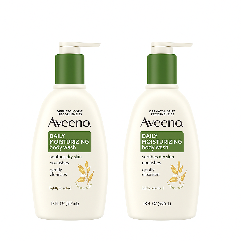 Two large bottles of Aveeno daily moisturizing lotion with oatmeal for 24-hour hydration