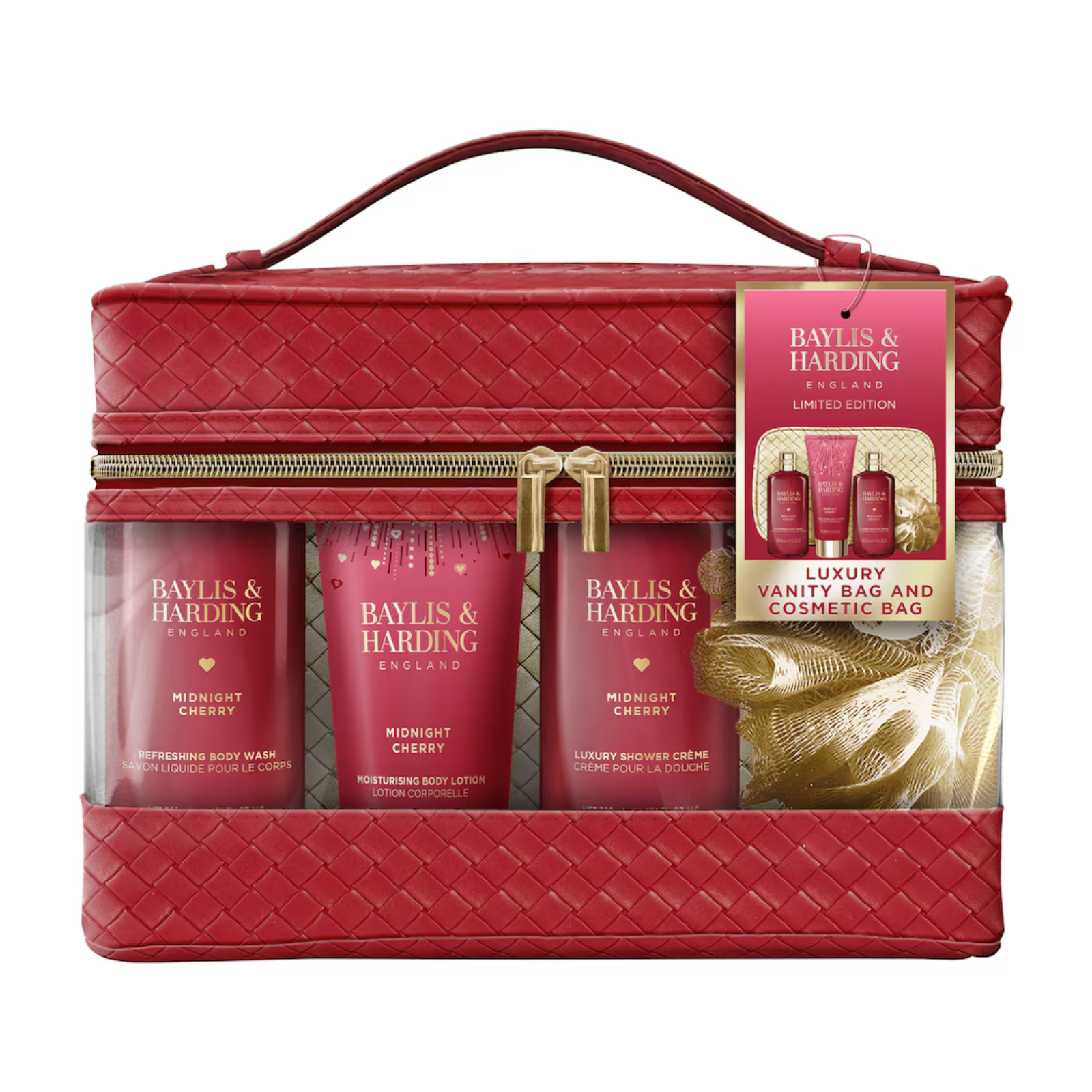 Indulge in a decadent symphony of the senses with the Baylis & Harding Midnight Cherry Luxury Vanity Bag Set. This limited-edition collection is a seductive and enchanting blend, designed for those who appreciate the mystery and allure of a rich, gourmand fragrance. The set is beautifully presented in opulent red and soft pink tones, accented with gold firework detailing that adds a “pop of party glamour” to any vanity.