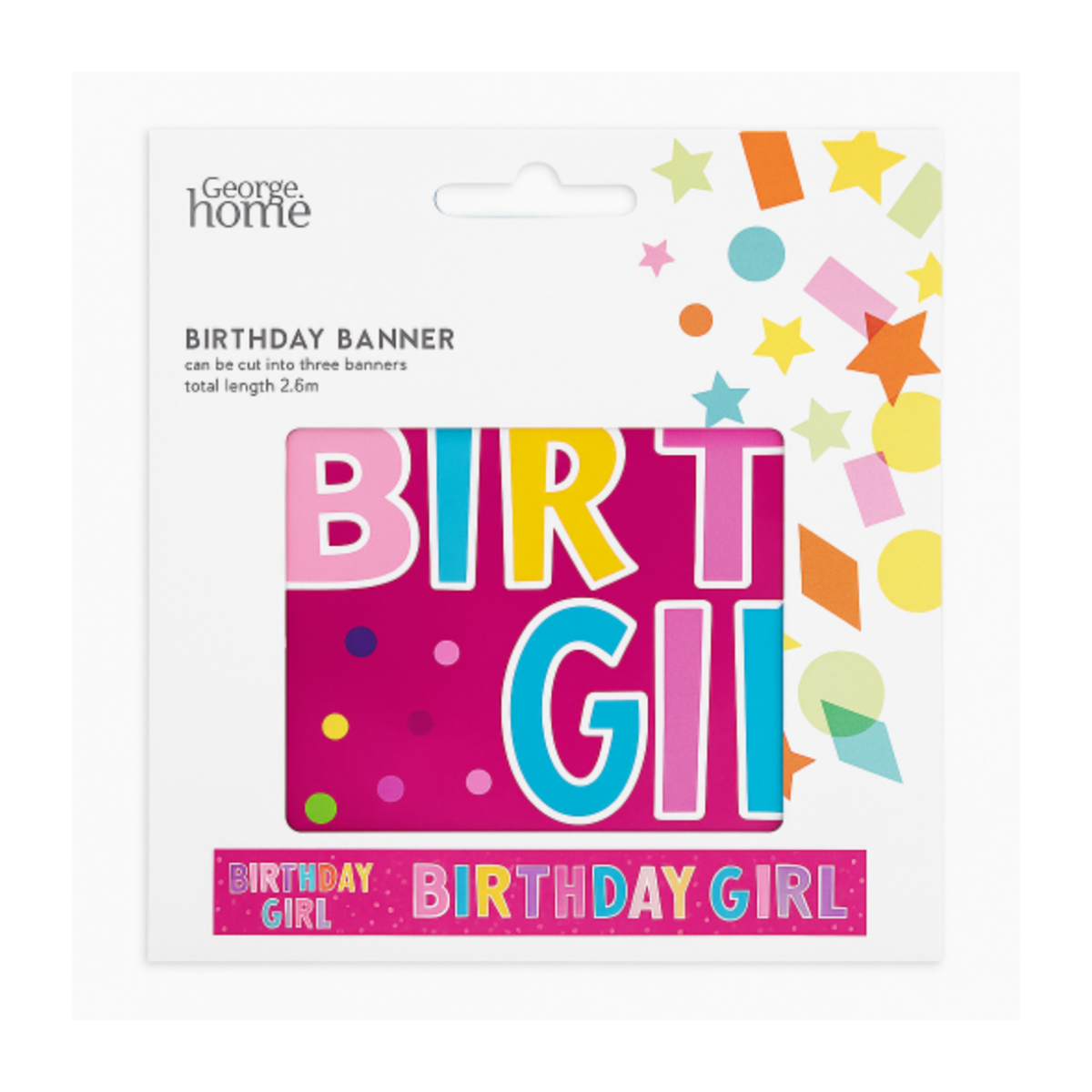 The George Home Birthday Banner (Girl) is a colourful and cheerful decoration designed to make any birthday girl’s celebration extra special. Featuring bold “Happy Birthday” lettering with a girl-themed colour palette, this banner instantly adds a festive touch to party spaces.