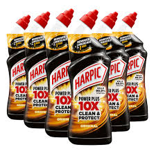 Six bottles of Harpic Power Plus toilet cleaner for maintaining clean and hygienic toilets
