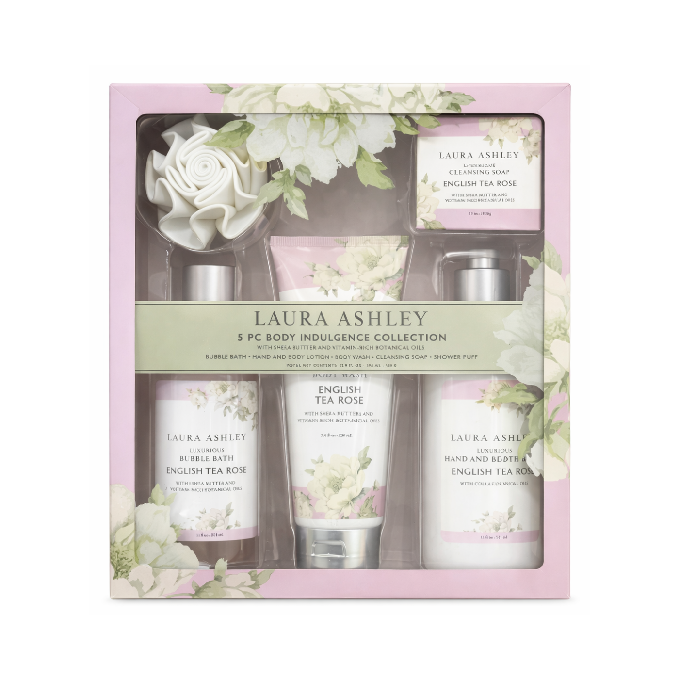 Indulge in a luxurious self-care experience with the Laura Ashley 5 Piece Body Indulgence Collection in English Tea Rose. This beautifully packaged set features a coordinated range of bath and body essentials, including bubble bath, body wash, hand and body lotion, cleansing soap, and a soft shower puff.