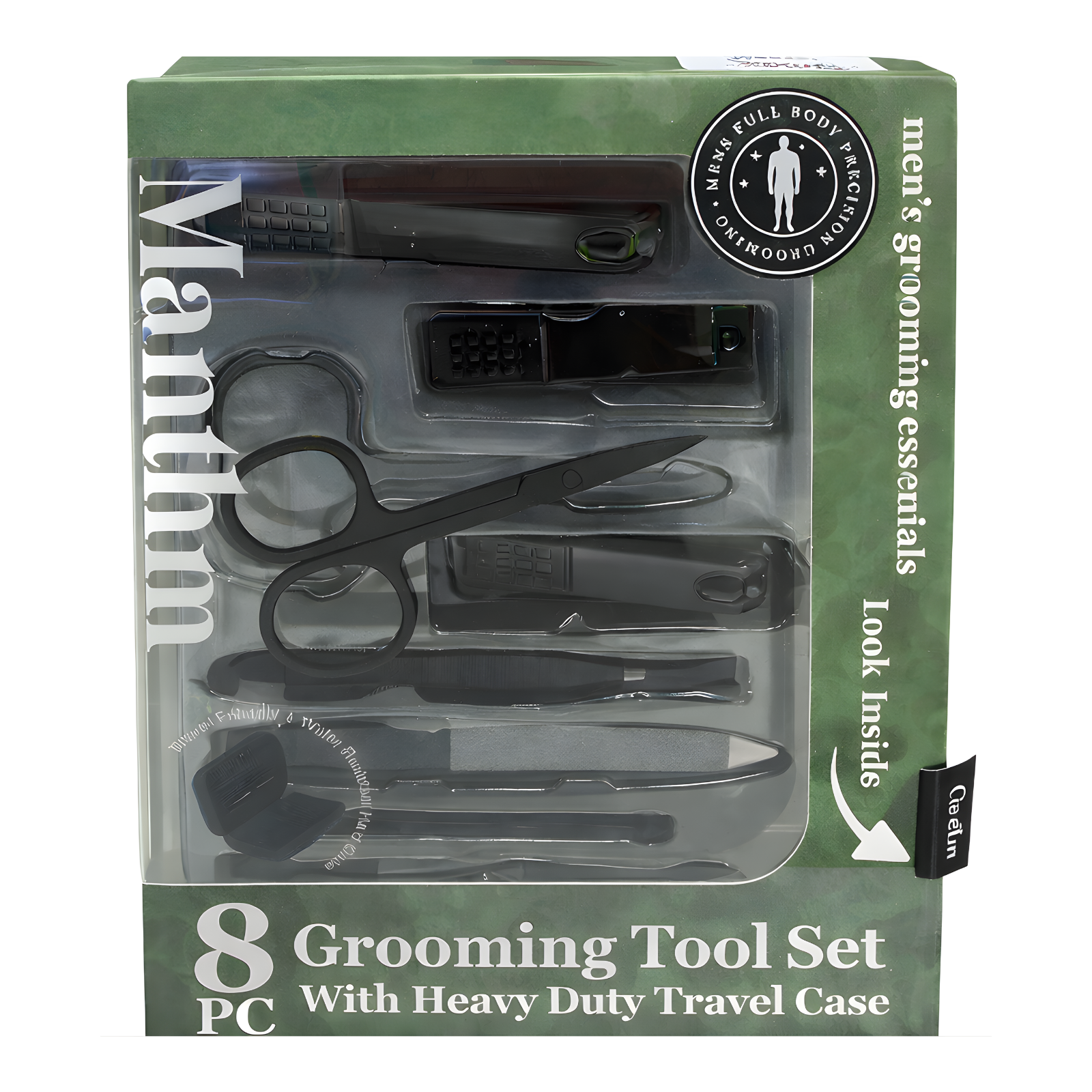 “Keep your look sharp anywhere with the Manthm 8-Piece Grooming Tool Kit. Includes premium stainless steel tools in a durable, heavy-duty travel case. Perfect for home or on-the-go care.”