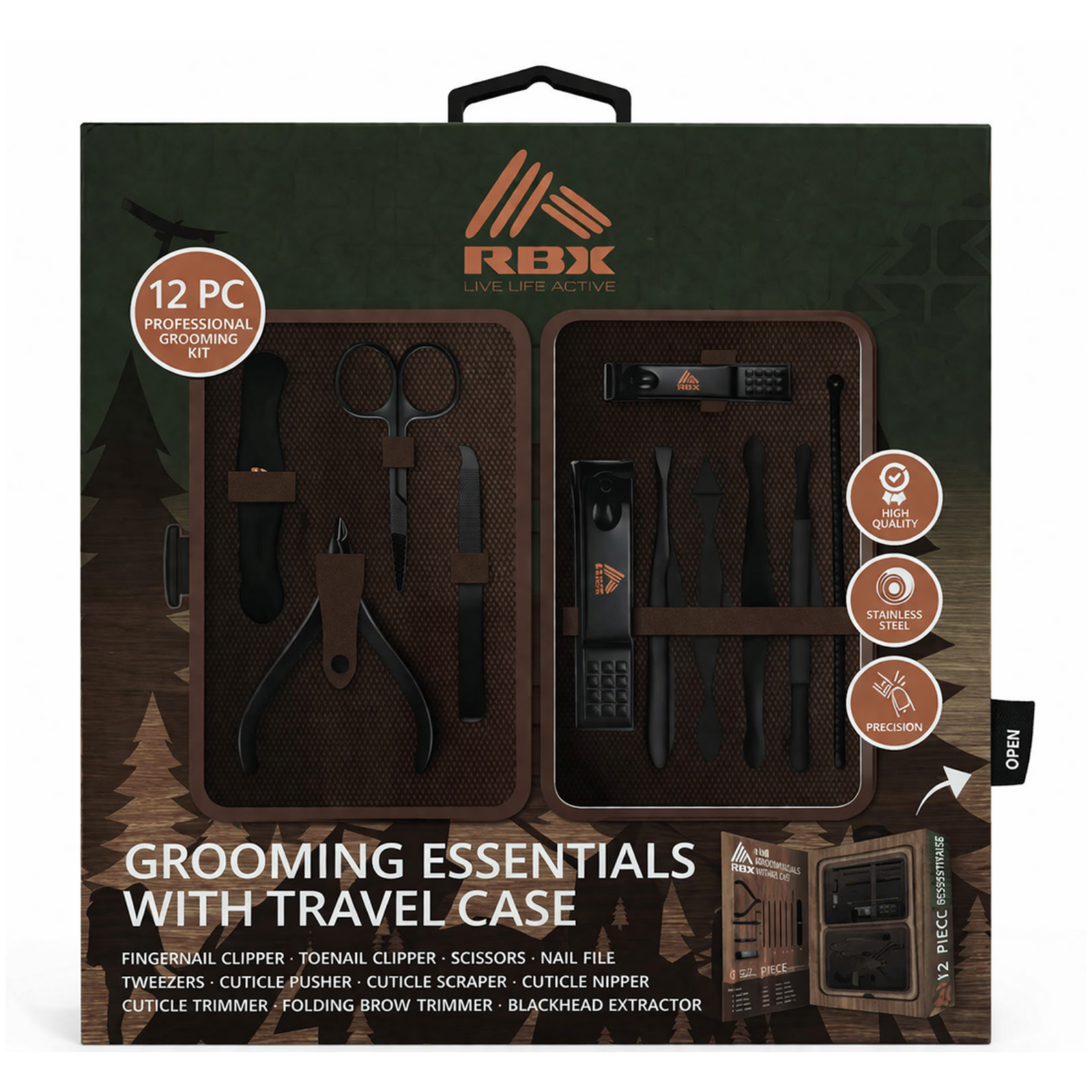 Stay sharp anywhere with the RBX 12-Piece Grooming Kit. High-quality stainless steel tools (clippers, scissors, trimmer) in a sleek travel case. Perfect for men.