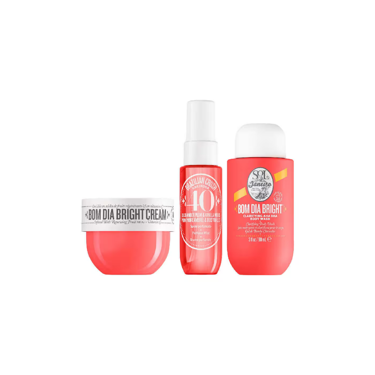 Cheirosa 40 Fragrance Mist: Alcohol Denat., Aqua (Water, Water), Fragrance (Fragrance) Bom Dia Bright Clarifying AHA BHA Body Wash: Aqua (Water, Water), Cocamidopropyl Betaine, Sodium Cocoyl Isethionate, Sodium C14-16 Olefine Sulfonate, Cocamide MIPA, Fragrance (Fragrance), Glycine Cerin, Salicylic Acid ic, lactic acid, Salix Alba bark extract (sauce), papaya carica fruit extract (papaya), musa sapientum pulp extract (banana), mangifera indica (Mango) pulp extract, Spondias Mombin (Cajá) pulp extract, coconut acid, sodium isethionate, sodium hydroxide um, dehydrogen acid acetic, potassium sorium bate, benzyl alcohol, ethylene brassylate, phenoxyethanol. Bom Dia Bright Body Cream: Aqua (Water, Water), Methyl Glucose Sesquistearate, Dodecane, Caprylic/Capric Triglyceride, Cetearyl Alcohol, Perfume (Fragrance), Phenyl Trimethicone, Cetyl Alcohol, Glycerin, Coconut Nucifera Oil (Coconut), Spondias Mombin Pulp Extract (Caa) ja), Musa Sap, a ientum (Banan) ana) Pulp extract, mangifera indica (Mango) pulp extract, papaya carica (papaya) fruit extract, Theobroma Grandiflorum (Cupuaçu) seed butter, Euterpe Oleracea (Açaí) fruit oil, Salix Alba bark extract (sauce), gardenia flower extract Taiwan itensis, ascort tetrahexyldecyl bate, tococo pherol, glyceryl caprylate, ethylhexylglycerin, sorbitan isostearate, ethylene brassylate, xanthan gum, glyceryl stearate citrate, hydroxyethyl acrylate/sodium taurate copolymer, sodium acrylate, sodium stearoyl glutamate, phenoxyethanol, benzyl alcohol, sorbate potassium, acid citric, sorbic acid. id, CI 172 00 (red 33), CI 19140 (yellow 5)
