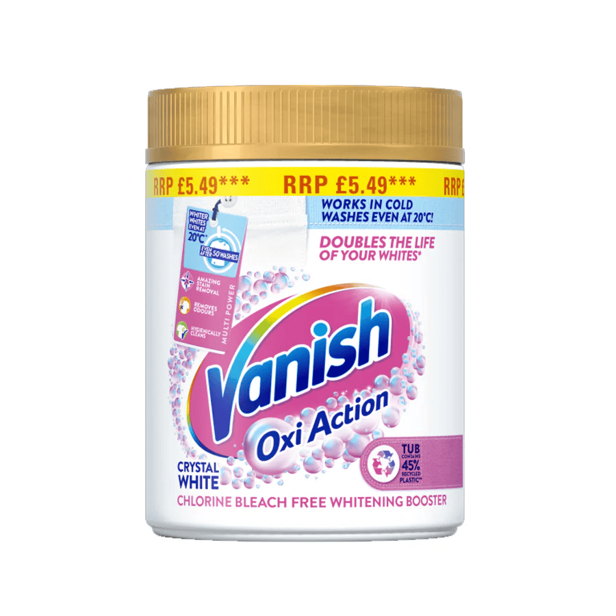 Vanish White Gold stain remover powder designed to keep white fabrics bright and stain-free