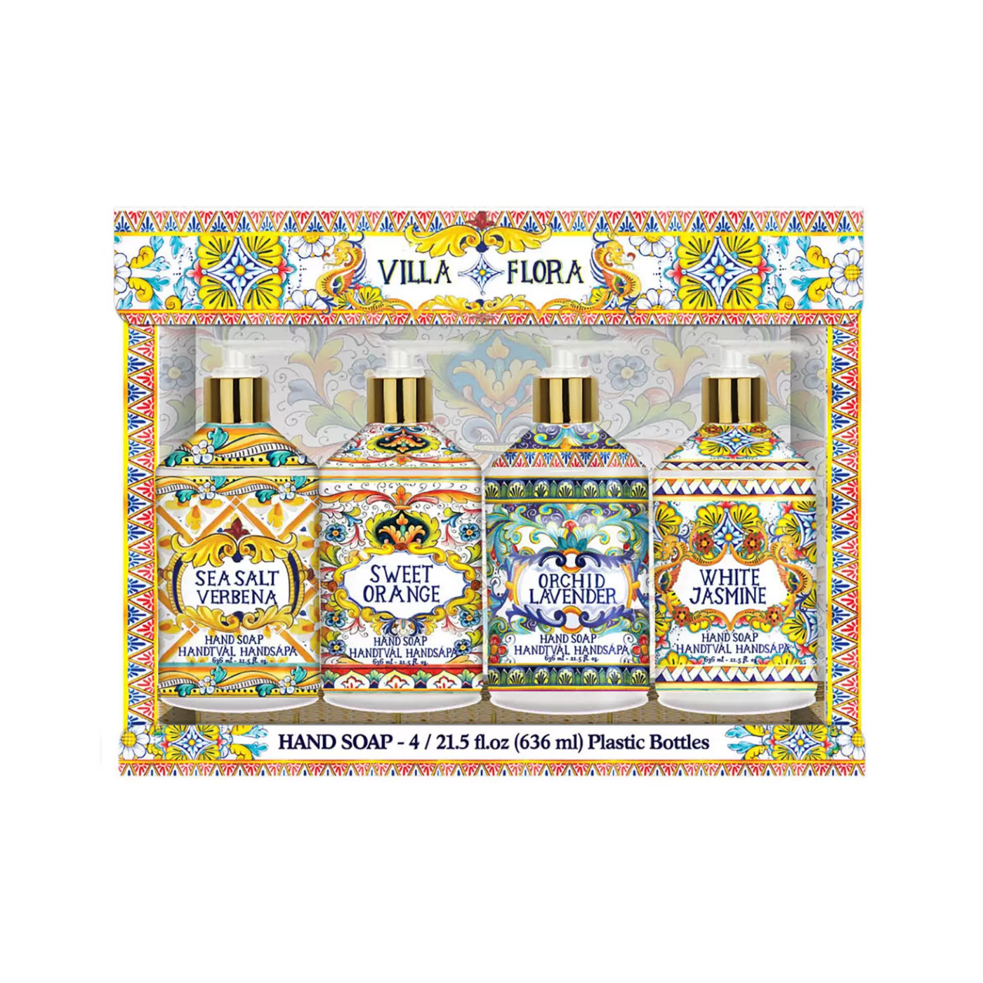 Villa Flora Liquid Soap has a vibrant design which adds an eclectic touch to any décor. Each drop is infused with the fresh fragrances of The Mediterranean fields of Lavender, Sea Salt Verbena, Sweet Orange and White Jasmine. This hand soap revitalizes, cleanses and leaves a long lasting aroma with every wash. It is the ideal gift for any occasion.